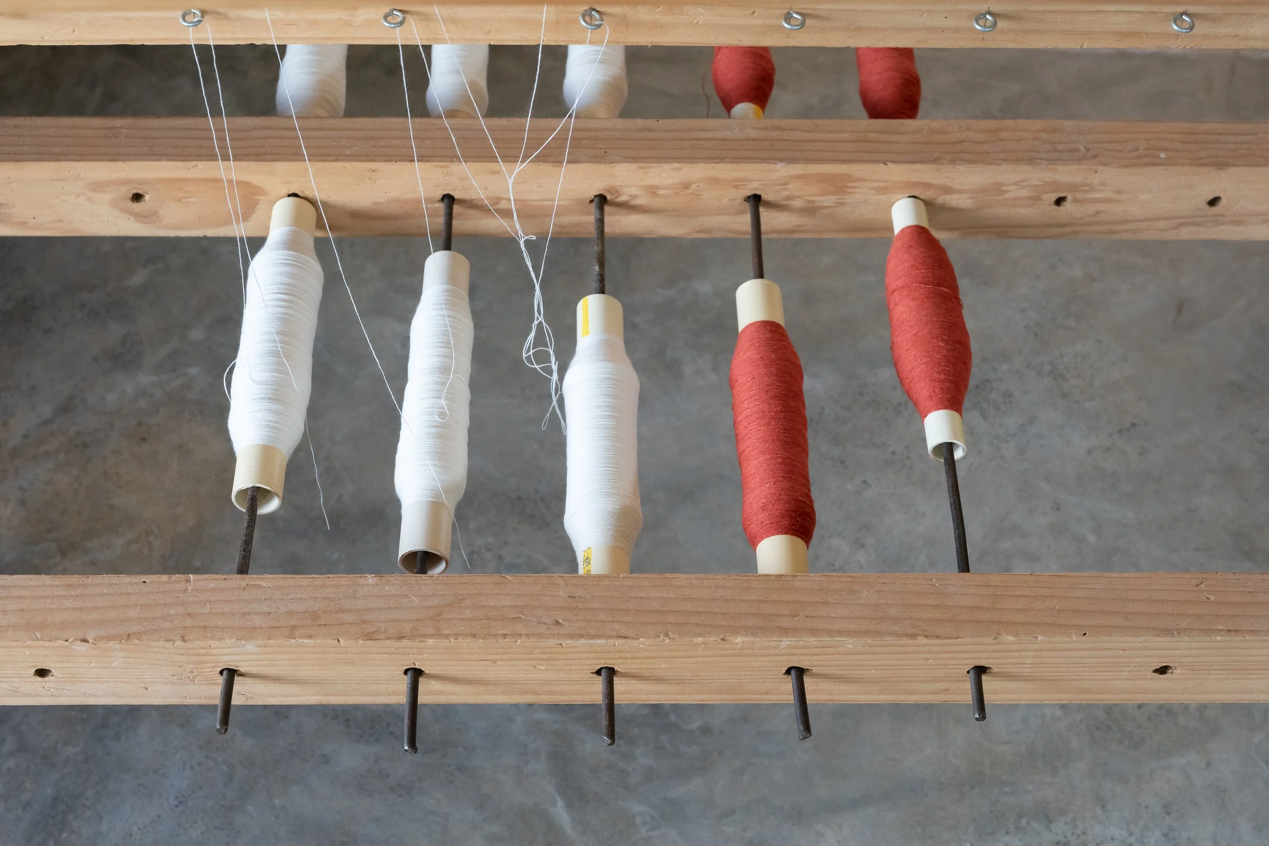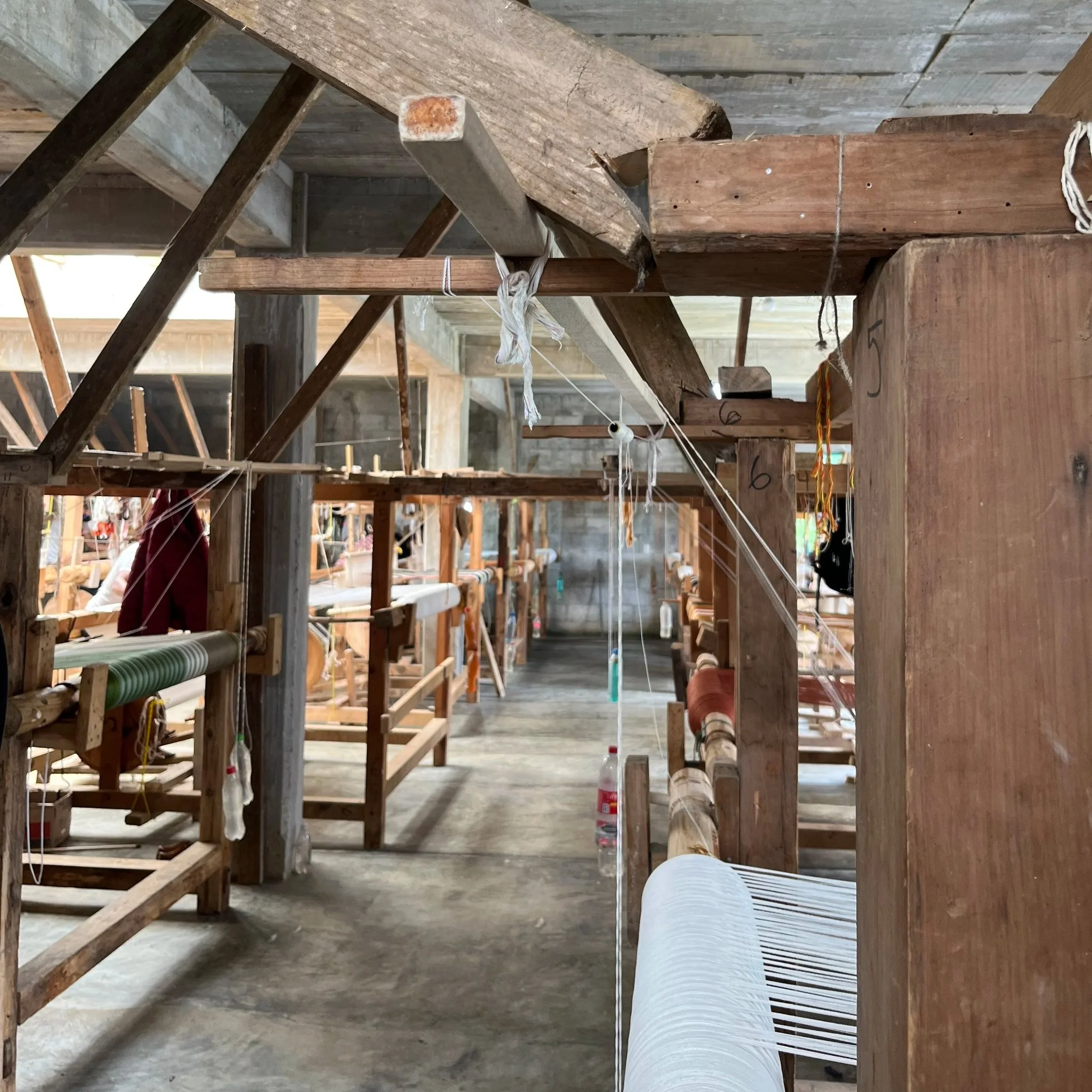 These larger wooden looms use foot pedals to lift and separate the warp threads, allowing a wooden shuttle to pass through more efficiently. The fabrics are still entirely handwoven by our artisan partners but the weaving process is significantly faster.